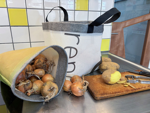 Er waren al die fijne tassen die Olivera maakte voor de biologische groenten van De Lijsterbes. Nu zijn daar deze fijne bewaartassen voor piepers en uien bij gekomen. Handig voor in de kast of kelder. De eerder gemaakte tassen voor het transport van groenten hebben zich inmiddels bewezen in hun functionaliteit. Al het materiaal is hergebruikt, en krijgt hiermee een tweede leven wat natuurlijk goed is voor het milieu!